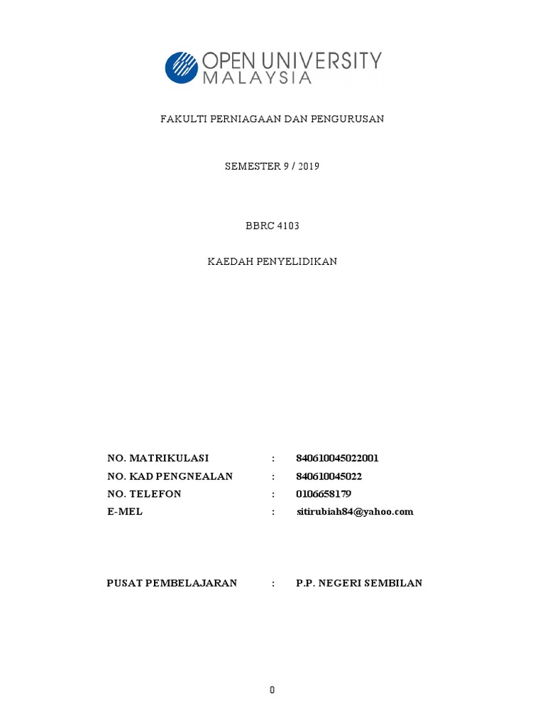 Asignment BBPB2103 V3 - bbpb. BBRC4103 OUM BUSINESS SCHOOL SEMESTER 9 TAHUN 2017 BBRC4103 RESEARCH METHODOLOGY ASSIGNMENT. Kelantan learning centre isi kandungan muka surat.