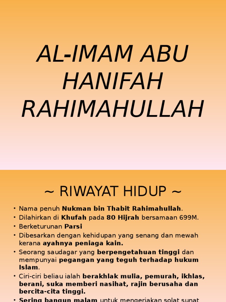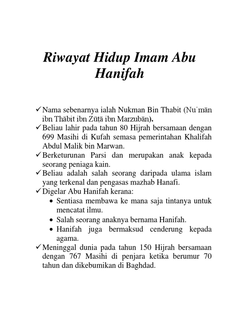 179 H Imam Syafii Muhammad bin Idris w. Menurut pengikut Imam Abu Hanifah dan Imam Ahmad keberadaan doa qunut subuh ini hukumnya tidak disunnahkan sebab hadits Rasulullah SAW yang mengungkapkan bahwa Beliau pernah melakukan doa qunut pada saat salat Fajar selama sebulan telah dihapus mansukh dengan ijma. Riwayat Hidup Tokoh Empat Mazhab Nama penuh Imam Abu Hanifah o Nukman Bin Thabit Al-Kufi CAHSMKBT 132 Tarikh lahir PENDIDIKAN ISLAM KSSM TINGKATAN 4 Tarikh wafat Kuniyah o 80 hijrah di Kufah Keperibadian o 150 hijrah o Abu Hanifah Antara guru yang o Sangat memuliakan ilmu pengetahuan.